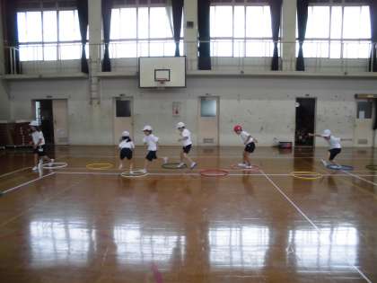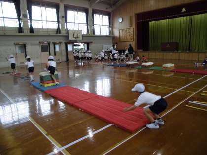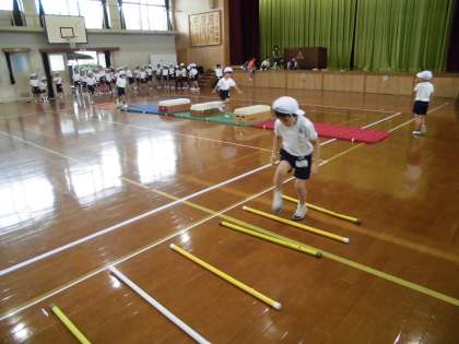 今回は,とび箱・マット・フラフープ・体操棒を使って,サーキットをしました。跳んだり回ったりして,とても楽しそうに活動していました。