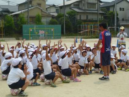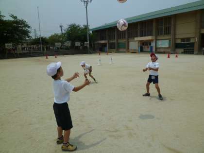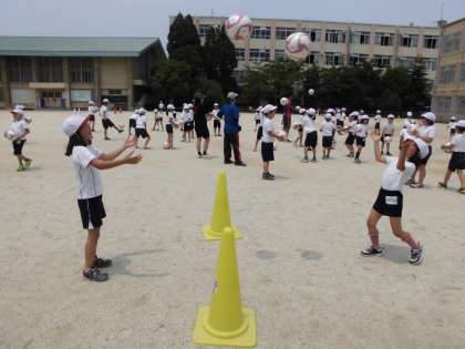 つづいて二人組でキャッチボールをしました。一回目は普通のキャッチボールだったのですが・・・二回目からはボールを二つ使って,お互いに投げ合うキャッチボールをしました。