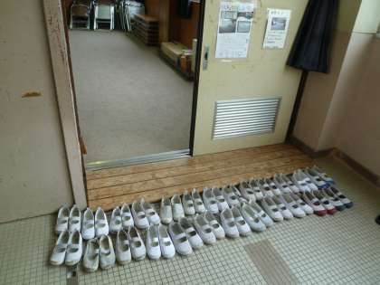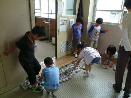 お話を聞くために,視聴覚室へ移動したときのことです。とても驚きました。こんなにきれいに上靴を並べられるなんて!それも,一人一人が自分の上靴をしっかりと責任もって並べようとしているのです。何人もが出入り口を通るので,その中で乱れてしまった上靴にも気付いて整えてくれる子さえいます。子どもたちの成長を感じた瞬間です。