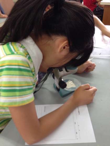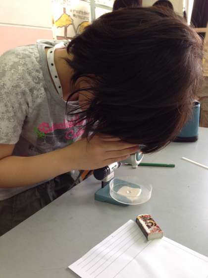 双眼顕微鏡を使い、メダカの卵の観察をしました。肉眼ではなかなか見ることのできない様子・・・。ん!?これが卵か!