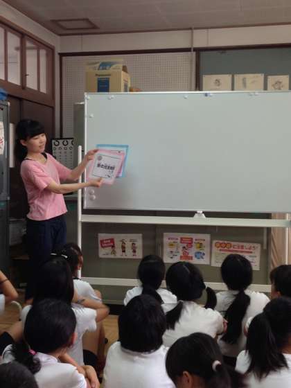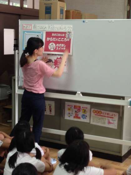保健室で「からだのスイッチ」について学習しました。朝、起きて元気よく一日をスタートするために必要なことは?体のスイッチを入れるもの・・・。それは・・・。