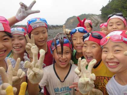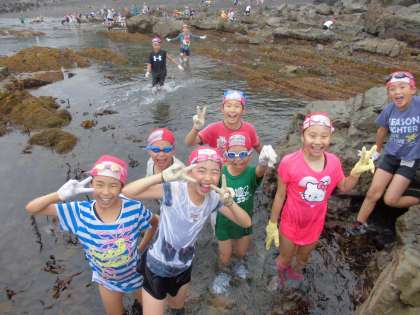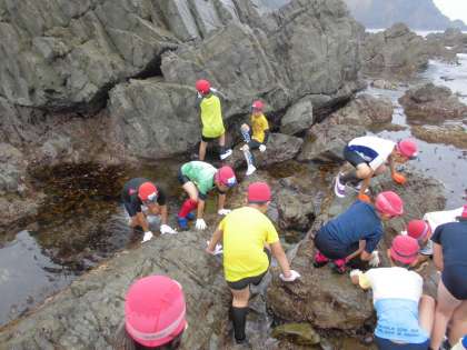 「生き物は,水の中や岩場の下にうじょうじょいました。また,わかめをめくると,ものすごい数のやどかりがいました。わたしは,がんばって生きているなぁ,生き物も私たちと同じでいきているんだなぁと思いました。」児童の感想