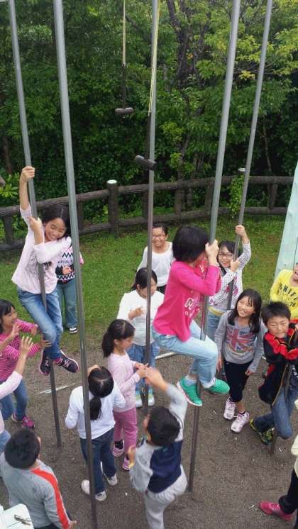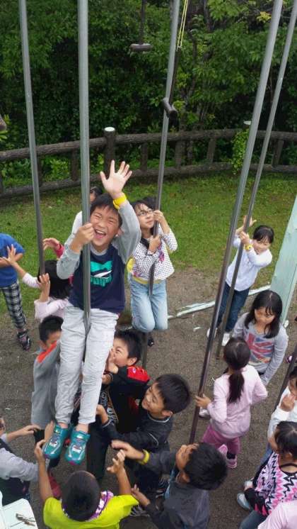 雨脚が強まり,班でのラリーをあきらめ,クラスごとにラリーのコースを回ることになりました。それでも,大きなカニを見つけると大興奮。さらに山の砦では,上り棒をのぼりきったものにだけ鳴らすことのできる鐘を発見!雨にぬれた鉄の棒を,必死によじ登りますが,なかなか鐘まで到達できません・・・。それでもコツをつかんでぐんぐん上る子が現れると,「がんばれー!」「もうちょっと!」と,温かい声援が飛び交いました。どんな状況でも,どんな場所でも楽しい遊びを見つけ,全力で遊べる子どもたち。センスオブワンダーを実感しました。