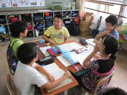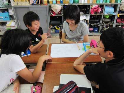 自慢できる建物や食べ物,人物などについて意見を出し合っています。