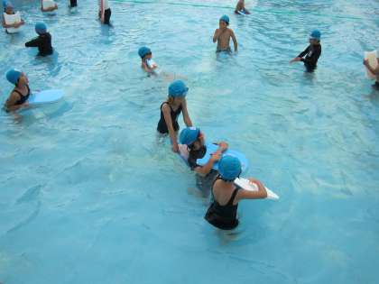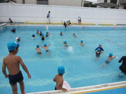 6月が始まったと同時に,1年生の「みずあそび」の学習が始まった頃…。水着の着替え方,シャワーの浴び方,体操の仕方等,一つ一つ学んでいきました。今では,バディ(2〜3人組)と遊びたい水遊びを決め,水なれをし,健康チェックまで自分たちでできるようになりました。水に入ってからも,友だちと関わりあいながら,めあてをもっていきいきと活動することができています!
