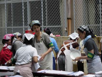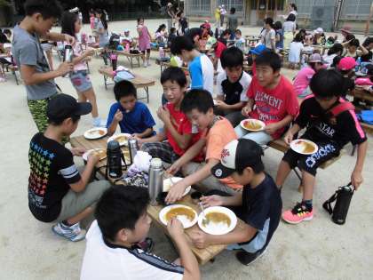 ドッヂビー(やわらかいフリスビーで行うドッヂボール)の後,カレーをいただきました。とても好評で,お代わりして食べている子どもたちもいました。