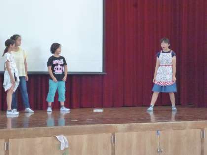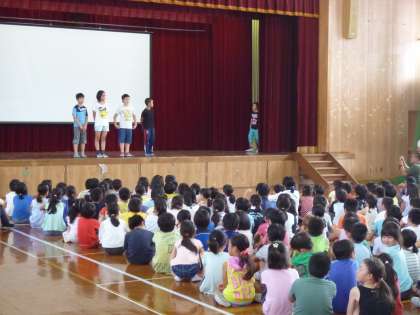その後の児童朝会では,「運営委員会」「給食委員会」「環境委員会」の子どもたちが寸劇をしたり表彰をしたりと,楽しい朝会を実施していました。
