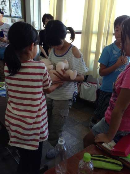 出産時の体重に近い赤ちゃんの人形を抱っこしました。思わず腰が引けてしまう人も・・・。みんなお腹の中で、大きく成長してきたのですね!命のつながりを感じました。
