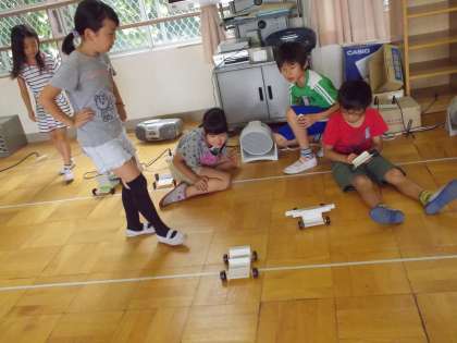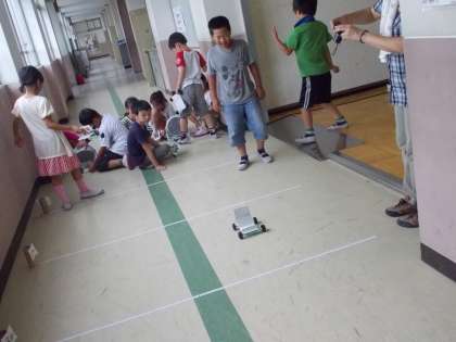 班の友だちと協力して車を走らせ、記録をとりながら楽しんでいました。