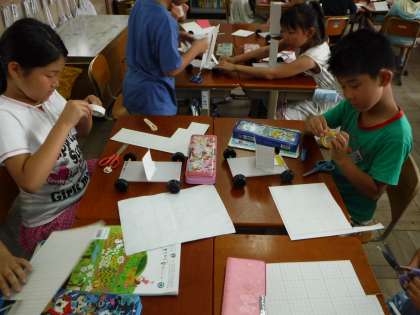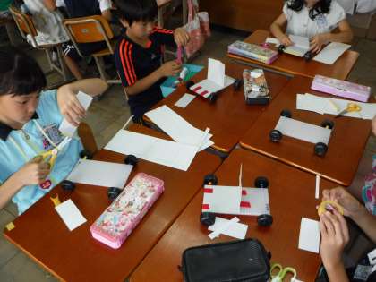 どのような車がより遠くまで進むのかを考え,風受けを工夫し