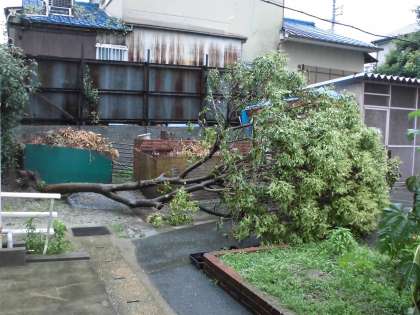 台風11号の接近で休校になるかと心配されましたが,いつも通りの授業となりました。今回は,風が大変きつかったですね。近くに停めてあったバイクや自転車が倒れていたのにも驚きましたが,なんと,北校舎の東側に植えてあった木が倒れているではありませんか。4メートル以上ある大きな木が倒れているのを見て,子どもたちも大騒ぎでした。