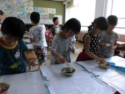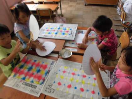 赤・黄・青の3色を和紙に染めて,うちわにせんたく糊でつけました。水の分量や色のつけ方次第で,様々な模様が出来上がるので,一つ一つとても素敵な作品になりました。