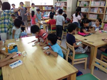 どうすればびっくり箱が作れるのかを一生懸命聞きながら,作業に取り組んでいます。