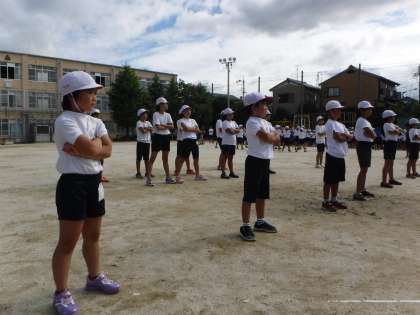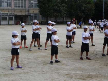 全校体育では,高学年の中に入って一生懸命声を張り上げ