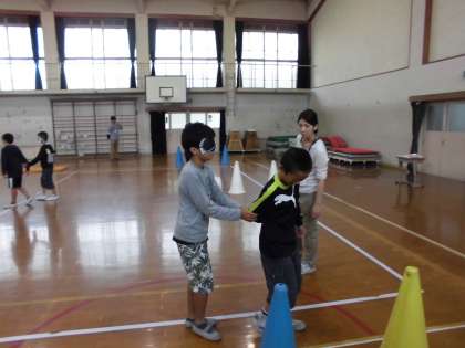 段差を上がるときや狭い道を歩くときなど,「段差があります」や「狭くなります」と声をかけてから進むことを教えていただきました。となりに人がいることで,安心して行動できることを体験することができました。