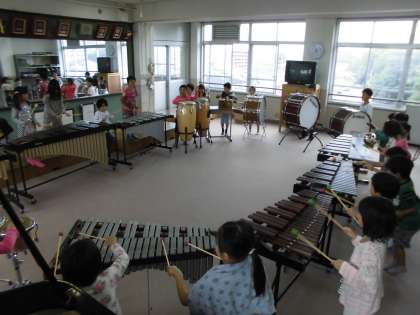 学芸会に向けて,いろいろな楽器について知るために,音楽室にある楽器を弾いたりたたいたりしました。