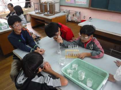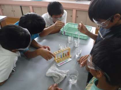 前回はリトマス紙を使って性質を調べましたが今回は「ムラサキキャベツ液」を使って調べました。