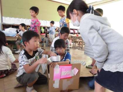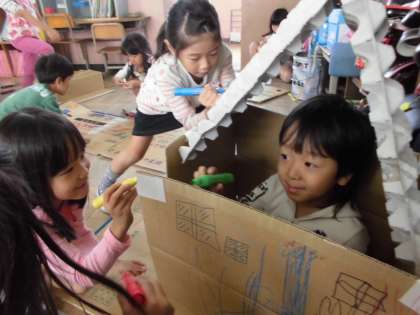 段ボールを使って家を作ったり,乗り物を作ったりして遊んでいます。