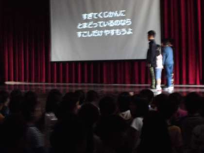なないろ学級の子ども達が舞台の上に立ち,全校合唱の説明をしてくれました。