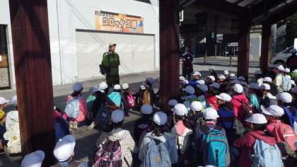 比叡山坂本駅に到着!話をしっかり聴ける5年生がいいですね。