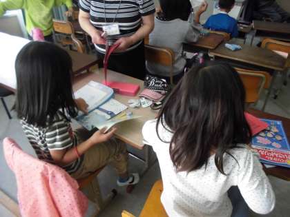 と,あいさつをして上靴を入れる場所,ランドセルを入れる場所,など一つ一つのことを確認しながら,教室に入りました。