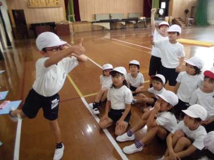 表現運動遊びで虫の動きのマネをして,踊ることを楽しんでいます。