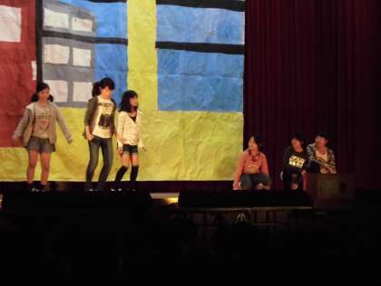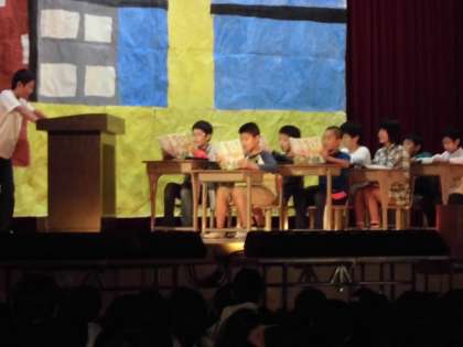 6年1組の劇で「未来討論会」です。