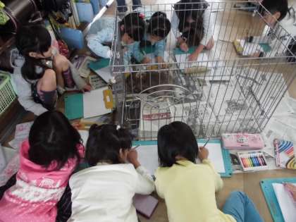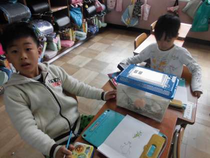 国語科の「しらせたいな、見せたいな」の学習では,学校にいる生き物を家族や友だちに知らせるために,絵をかいたり,文で説明したりする学習です。