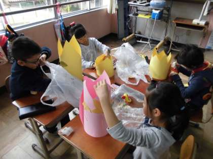 藤ノ森小学校の運動場で見つけた葉や小枝を使って冠作りをしました。