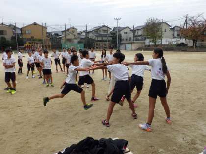 タスキ渡しの練習をしています。仲間の思いがたくさんつまったタスキを受けて,いいスタートを切っていきましょう。