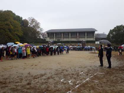 開会式が始まりました。雨がきつくなってきたので傘をさしての開会式です。