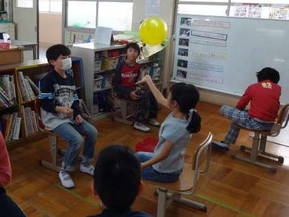 なないろ学級では風船バレーに取り組んでいます。ラリーを多くつなげることをめあてにしています。新記録を出すために、円陣を組んで「がんばるぞー!」の掛け声をかけたり「○○くん!」とパスする友だちの名前を呼んだりしながら工夫しています。新記録が出たときにはみんなでハイタッチをして喜びました。