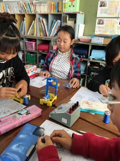 電磁石はどのようにすれば強くなるのかな?そんな疑問から実験をスタート。まず実験装置の組み立て。これがなかなか…難しいです。