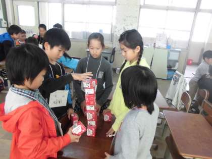 たてわりグループで集まり,牛乳パック積みをして遊びました。