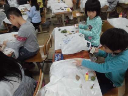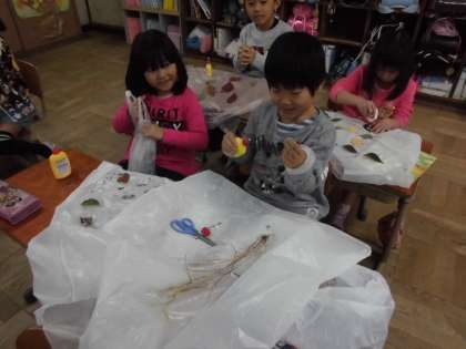 パート1は洋服づくりです。自分で選んだ袋に思い思いの宝物を貼りつけていきました。