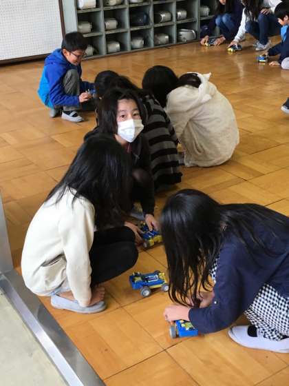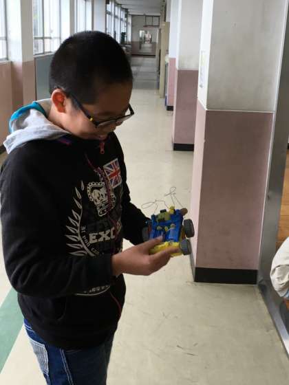 作った自動車を実際に走らせてみました。タイヤがポロリ・・・というアクシデントもありましたが、電磁石の力を感じました。