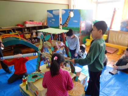 1月21日(木)から始まる「小さな巨匠展」の準備のため、砂川小学校・竹田小学校の友だちと一緒に作品を作りました。友だちと協力して立派な作品ができました。