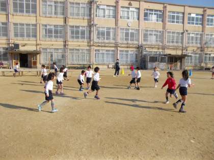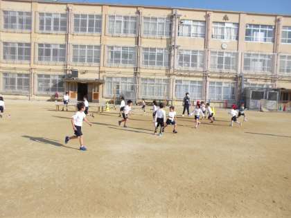 持久走の後、みんなで鬼ごっこをしました。何周も走った後なのにとても元気に楽しんでました。
