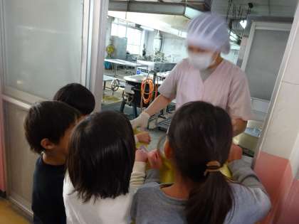 調理員さんが,笑顔で受け取ってくれて,子どもたちはとても嬉しそうでした。これからも,給食をたくさん食べて,すくすく育って欲しいと思います。調理員さん・栄養教諭の先生,本当に毎日ありがとうございます。