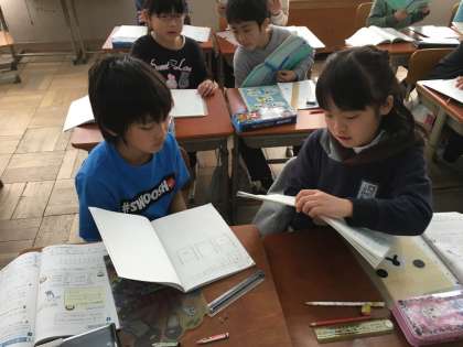 絵や図や言葉を使って,友だち同士で計算の仕方を伝え合っています。