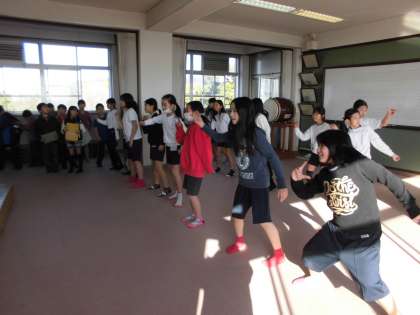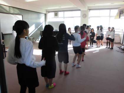 今回は,子どもたちで振りを考えています。友だちどうしで振りの確認をしたり,移動の確認をしたりしています。しっかり打ち合わせをしてタイミングを合わせています。