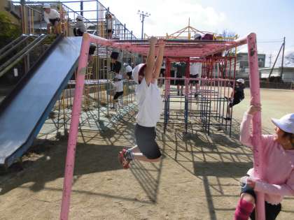 体育の学習時に,少しずつ総合遊具で遊ぶ練習をしています。