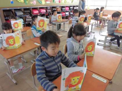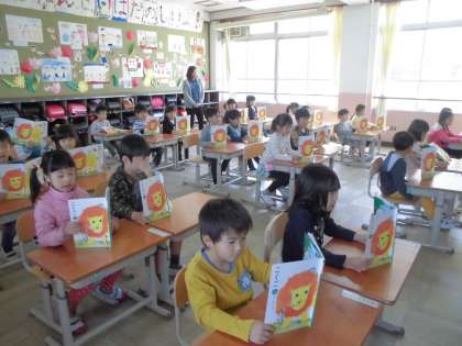 先生のあとに続いて,明るく,はっきりした声で読む練習をしました。