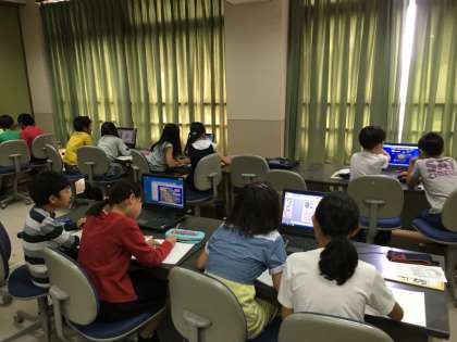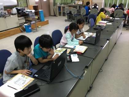 コンピュータを使いこなして浄水場について調べている子どもたち。
