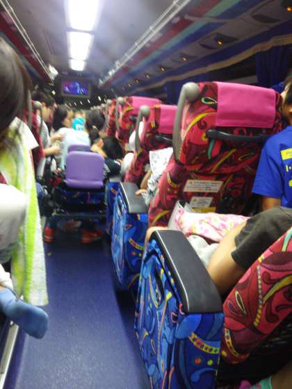 バスの中ではDVDを観ています。…が、ほとんどの人が眠っています。疲れましたね。