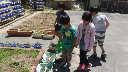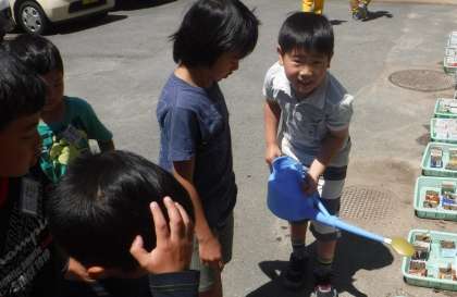 前回の学習で植えたホウセンカとヒマワリの水やりを班のみんなで回しています。