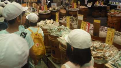 子どもたちもいろいろなお店に興味津々!お漬物屋さんや干物屋さんといった校区ではあまり見ないお店もたくさんありました。