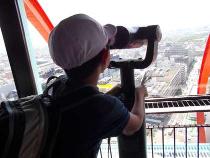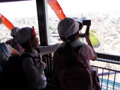 京都タワーをのぼり、京都市内を一望するこどもたち。