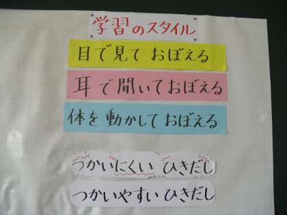 おかげさまで徐々に本教室についての理解が子ども達や保護者、地域の方々にも浸透しつつあります。毎年各クラスに通級のことを正しく理解するための授業をしておりますが、子ども達の素直な反応にはいつも感心しています。あるクラスの理解授業の二、三日後、休み時間に教室にいってみたら、漢字の書き取りテストの間違い直しをする男の子がいました。周りでは数人のクラスメートが丁寧に教えてあげながらこんなことを話していました。「・・・うん、そうそう、〇〇ちゃんは、見て書いて覚えるタイプかなあ、見本を何回も見て書いたら書けてるやん!」「そうかな、僕も西村先生の話の時そんな気がしてた。」とにこにこしてやりとりしていました。理解授業では『だれにも得意、不得意があるね。聞くことが得意な人。見ることが得意な人。体を動かして覚えるのがいい人。上手くいかない時はやり方を工夫してみよう。』という主旨の話をしていたので実際に友達を思いやる場面でこのような会話があったことを大変うれしく思いました。