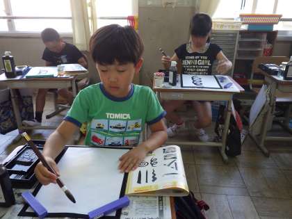 一筆ひとふで、丁寧に書きました。始筆・送筆・終筆が筆だと難しく,苦戦している様子でしたが,一人ひとり力強く,味のある線を書いてました。